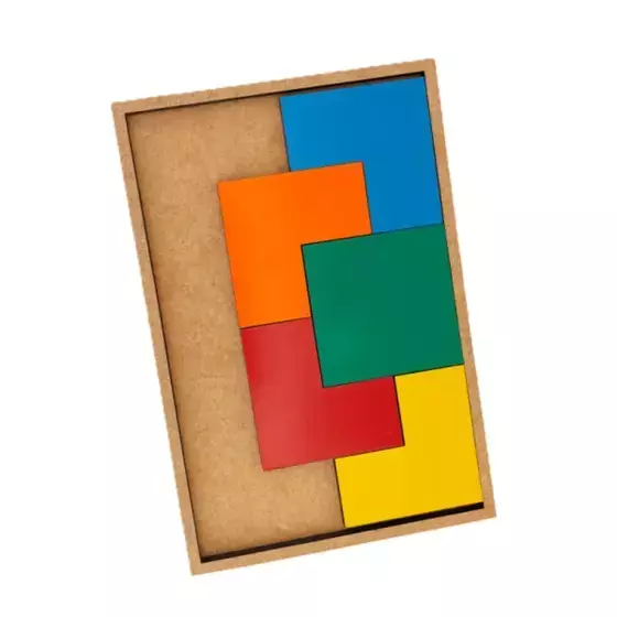 Feito em MDF resistente, o jogo consiste em movimentar as peças até formar o quadrado perfeito dentro do tabuleiro.