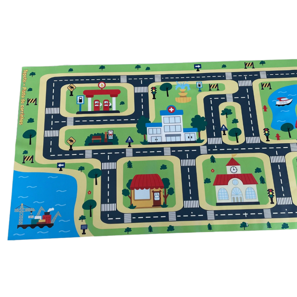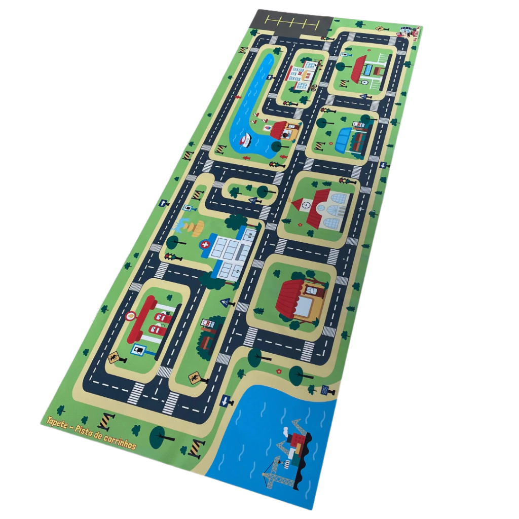 O Tapete Pista de Carrinhos Divertida é perfeito para transformar a brincadeira em uma verdadeira aventura! Com 1,90m de comprimento por 70cm de largura, ele traz um circuito cheio de ruas, avenidas, prédios, escolas, hospitais, lojas e até rio com ponte, criando um cenário criativo para as crianças soltarem a imaginação.
